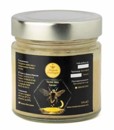 Cream honey with banana is a delicate and velvety combination of fine, creamy, natural honey and the natural sweet taste of freeze-dried banana powder. The harmony between the honey softness and the fruity aroma creates a pleasant and balanced temptation for young and old.