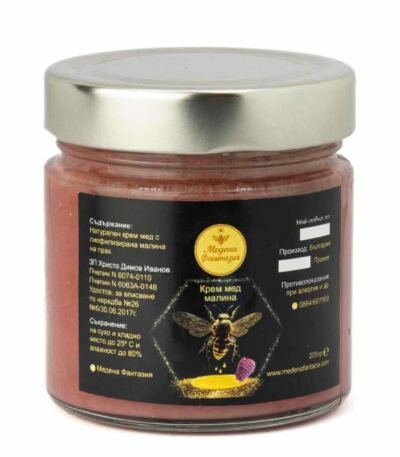 5,50 €205 g.Raspberry Cream Honey combines the velvety texture of fine, creamy, natural honey with the natural fresh-fruity taste of freeze-dried raspberry powder. The subtle sweetness of the honey and the light acidity of the raspberry create a balanced and refreshing taste experience.