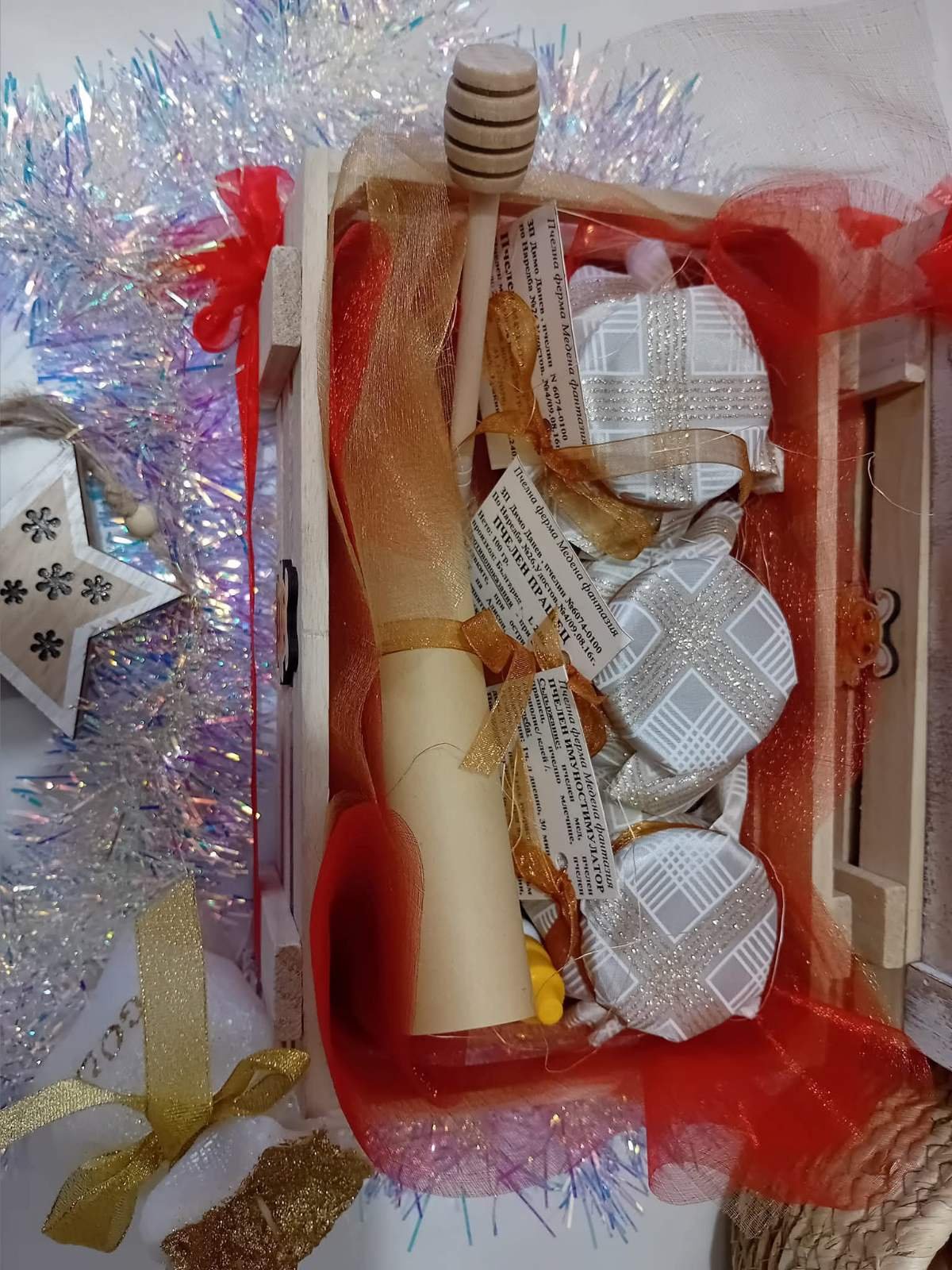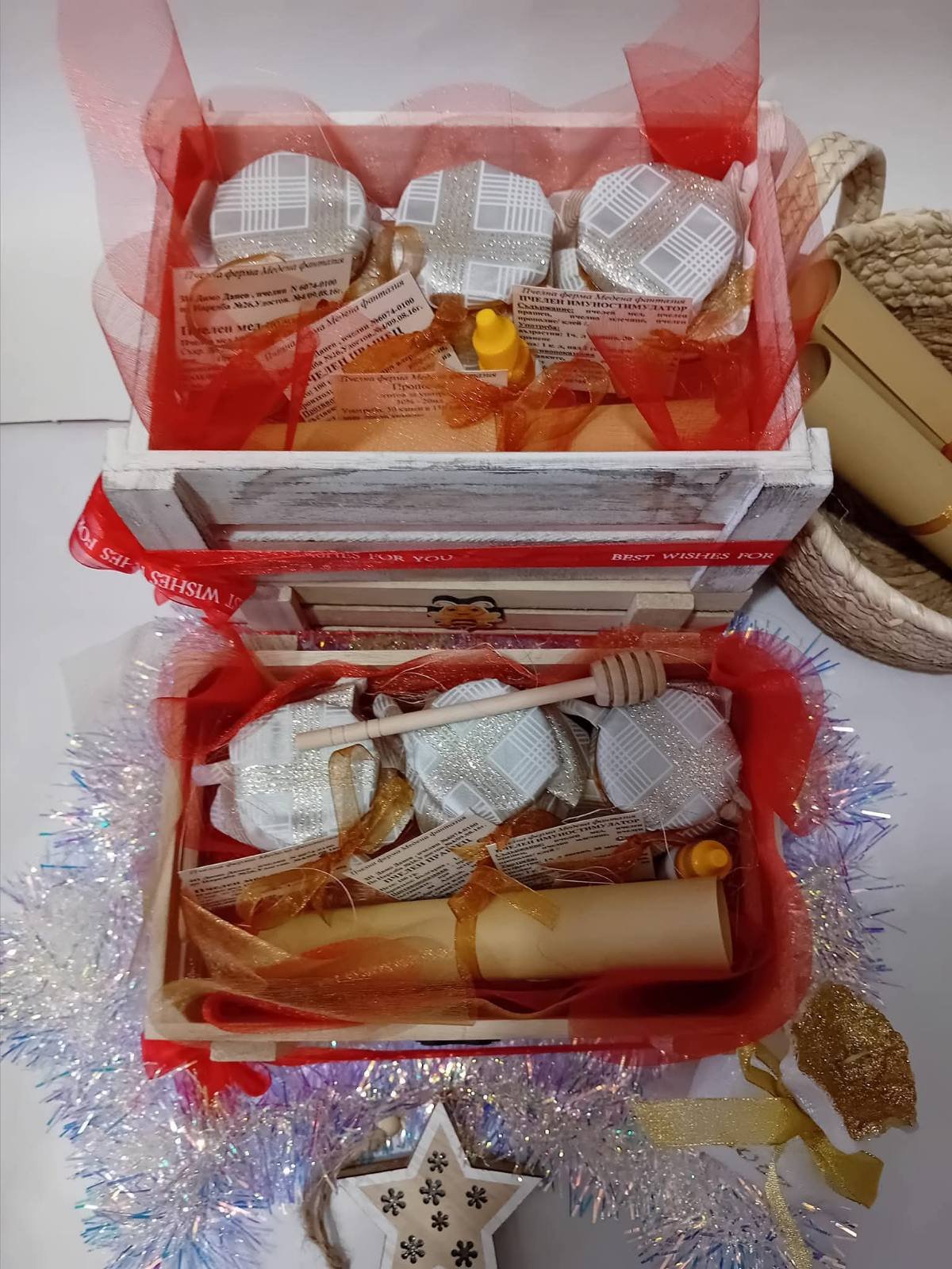 Всички продукти са опаковани в подаръчна щайгичка, готови за поднасяне.