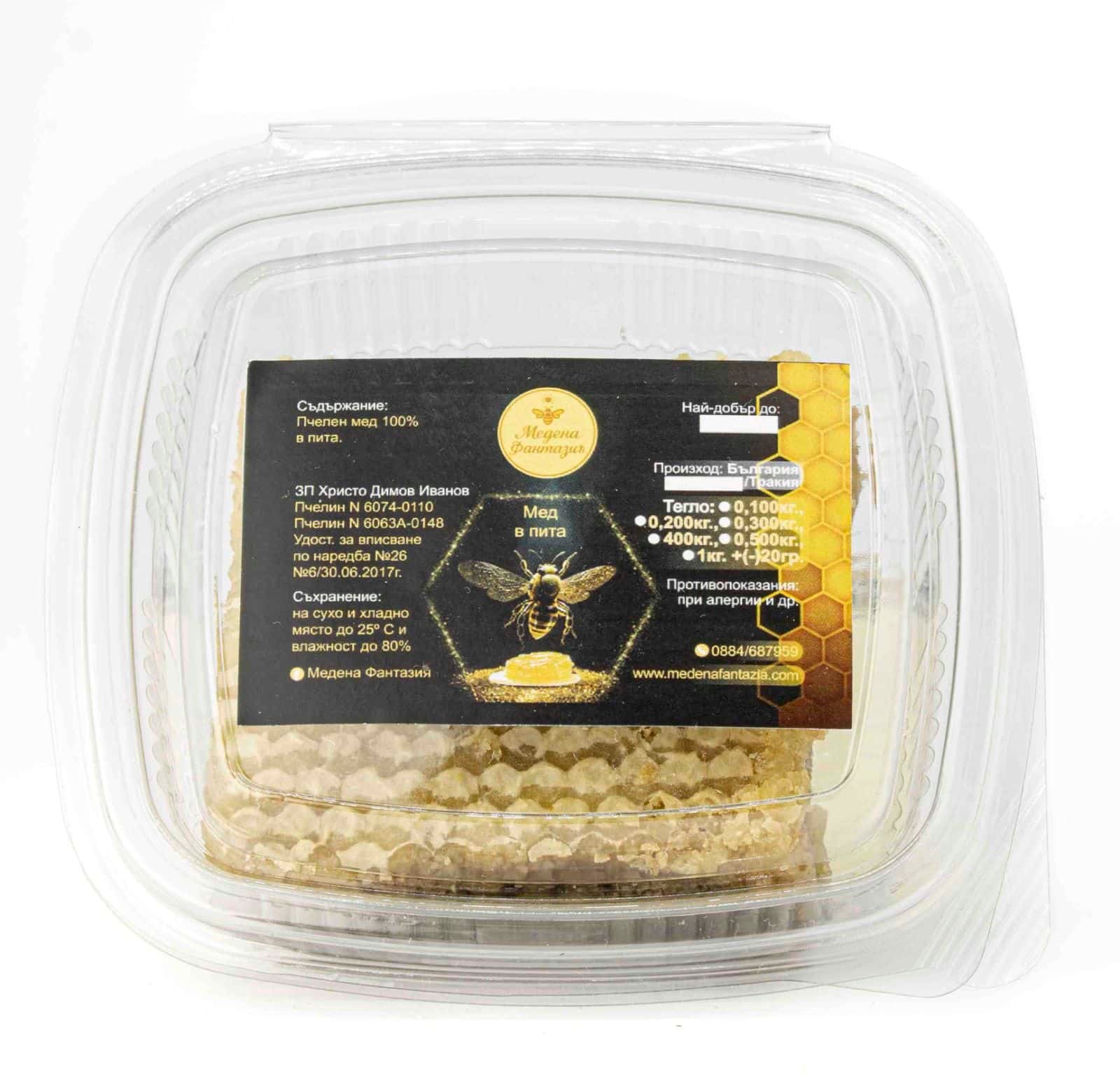 Медът с пчелна пита „Медена фантазия“ съчетава чистия вкус на натурален пчелен мед с уникалната структура на пчелната пита. Този продукт предлага автентично изживяване от кошера, където медът е събран и запазен в естествената си форма, точно както го създават пчелите.