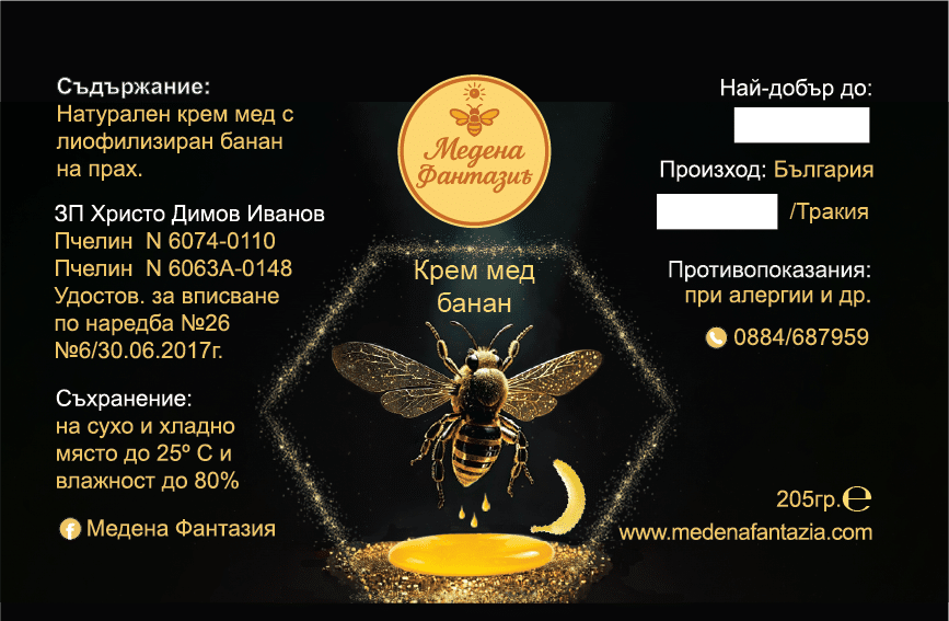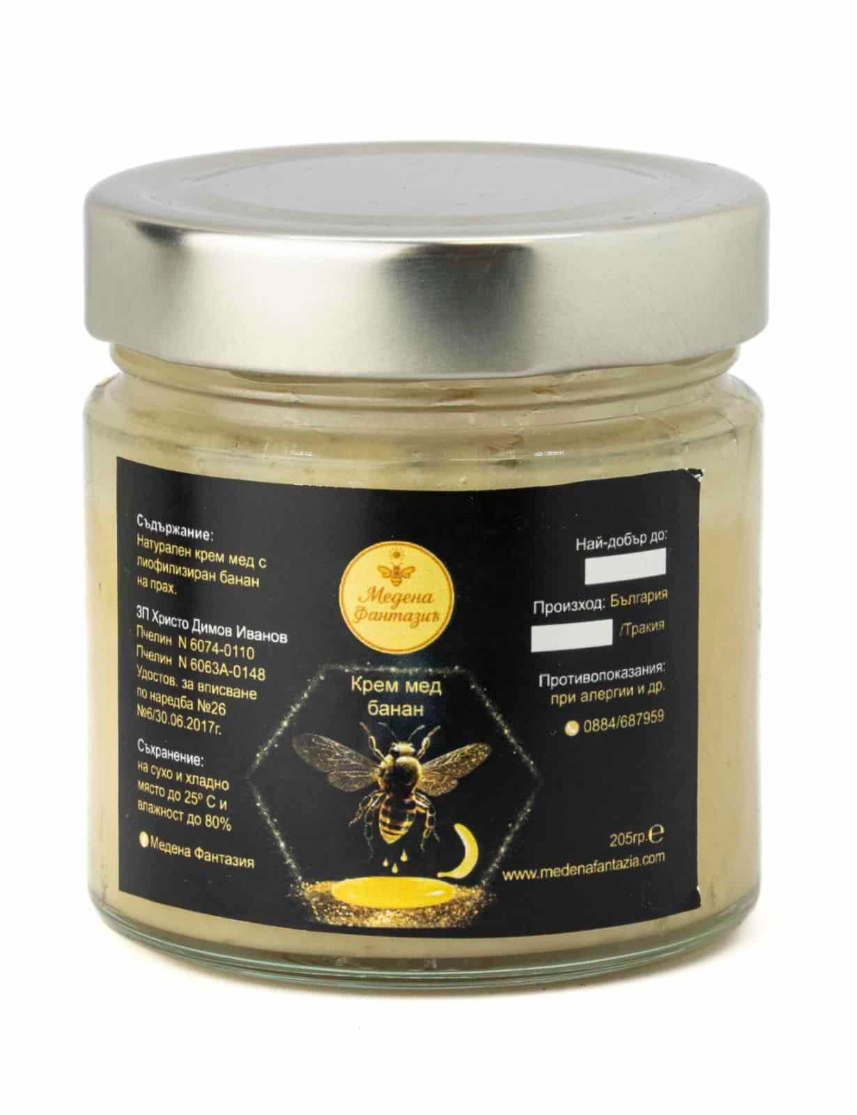Крем медът с банан е нежна и кадифена комбинация от фин кремообразен, натурален, пчелен мед и естествения сладък вкус на лиофилизиран банан на прах. Хармонията между медената мекота и плодовия аромат създава приятно и балансирано изкушение за малки и големи.